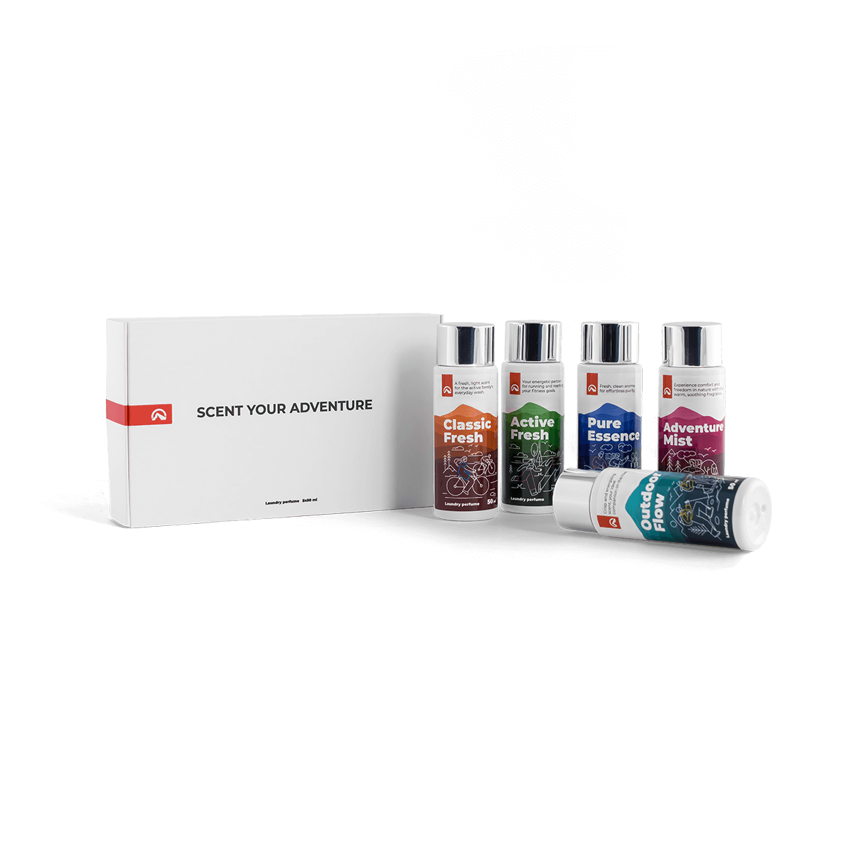 Active Fresh (lime, grapefruit, fresh-ozonic) · Adventure Mist (cedru, vetiver, woody-green) · Pure Essence (bergamotă, lămâie, mosc alb) · Outdoor Flow (verde-ozonic, airy) · Classic Fresh (floral curat, airy)